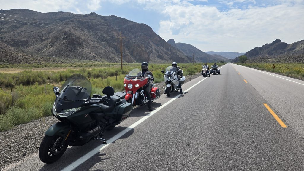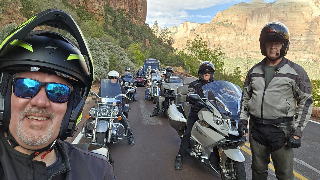 We re-adjusted our riding gear for the slightly higher elevations of Zion motored north and west toward home. Dawn Derenski needed the mandatory group shot as we queued up at the east park entrance. I missed Steve Black’s request for a stop in Springdale for more motion lotion for his Valkyrie. A good portion of the flock pulled off there. Saw some at breakfast Friday, so I guess there were no more dead batteries.